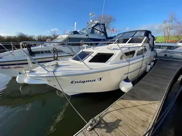Enigma X is a 3 owner example of the Seamaster 27 manufactured by Viking Mouldings, the boat offers excellent river navigability including the upper reaches of the Thames as it features a folding windscreen. Power by an inboard shaft drive diesel with a bow thrust the Seamaster 27 is the perfect design for low speed inland cruising. The Boat features a spacious cockpit with seating for 6/8 with ease. Below decks the cabin offers accommodation for 6 to sleep or 6/8 for day use, large windows give good natural light and a separate spacious wet room / toilet is included. Wide side decks encompass the vessel making her a great family boat. Enigma X has been recently surveyed, serviced and prepared before marketing and is fully available for the season